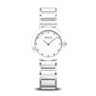 Dansk design inspireret af den smukke arktiske natur møder hightech keramik - ridsefast, let og allergivenligt materiale. Moderne elegance kombineret med klassisk minimalisme. Glansfuld urkasse af rent rustfrit stål (316L), som også anvendes inden for medicinalindustrien. Glatpoleret "Smooth touch" overflade på keramikken giver en let og behagelig bærekomfort. Hvid urskive med strålende Zirconia elements, som beskyttes af særdeles hårdt, krystalklart og ridsefast safirglas.
