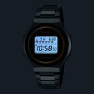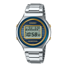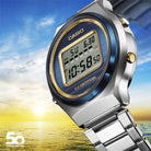 Celebrate 50 years of Casio watches with a beautifully updated Casiotron that symbolises Casio's determination to stay true to who we are, while constantly innovating. This special limited-edition re-creation features a special commemorative colour scheme and design with Casio colours, materials, and finishes that evoke the omnipresent yet ever-changing nature of the sky, the sea, and the sunlight — shining today and forevermore. The iconic fluted pattern of the original Casiotron, logo, buttons, and other details are accented in a gold hue inspired by the look of brilliant sunshine. Paired with a dark blue hue evoking the sky and sea, the design is a study in beautiful contrast. Glass with blue-toned printing adorns the stainless-steel screw-lock case back, which also features the 50th anniversary logo in a gold hue. A gold-and-silver bicolour finish is applied to the tri-fold clasp that, when opened or closed, reveals an engraved triangle pattern and "50th Anniversary" lettering in the golden folded section. This very special 50th anniversary-worthy Casiotron is packaged plastic-free in a paper box, in keeping with the Casio commitment to the environment.