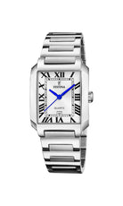 Festinas D. ON THE SQUARE er et elegant rektangulert ur med romertal, datovisning og flotte blå anløbne visere på en lænke af rustfri stål.