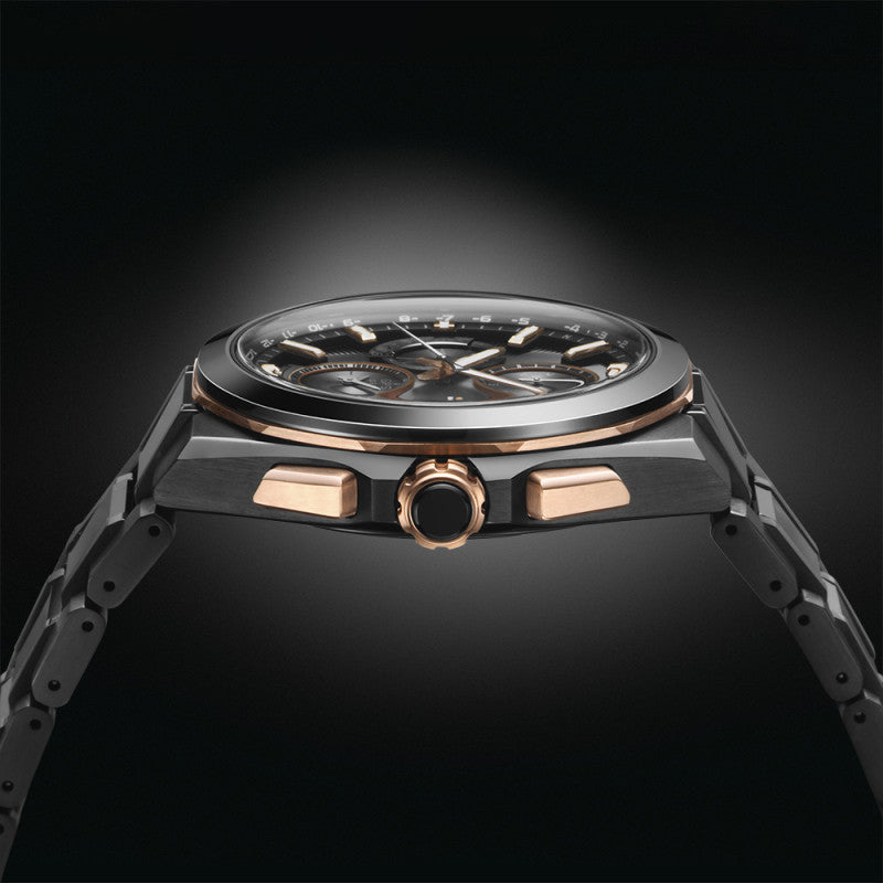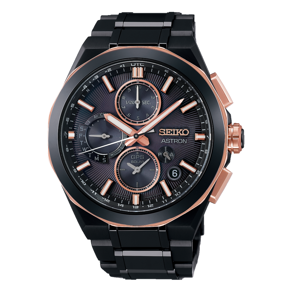 Seiko præsenterer kombinationen af dual time-teknologi, GPS og stopfunktion med den nye kaliber 5X83. For første gang i Astrons historie giver dette mulighed for at måle stoppet tid op til 12 timer i trin på 1/20 sekund. Takket være den sorte karboniserede titaniumkasse og det dobbeltkuplede safirglas med »Super Clear«-behandling er dette ur både behageligt at have på og let at aflæse. Begrænset udgave af Seiko-mærkets 100-års jubilæum.