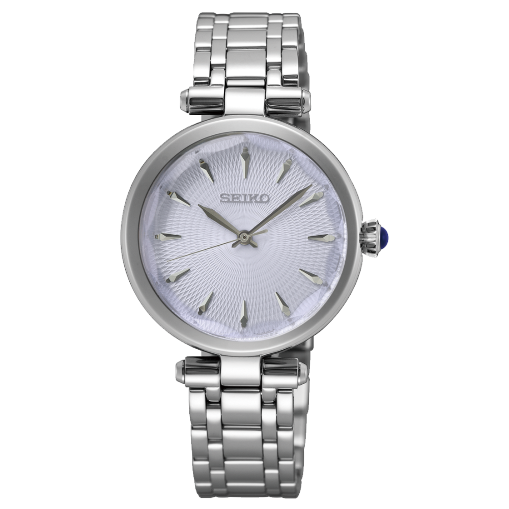 SRZ553P1-uret er ideelt til at fuldende din formelle påklædning. Det er kendetegnet ved urkassens klare form og den strukturerede urskive. Uret er lavet af rustfrit stål , et facetteret hardlex-glas og en cabochon-krone, der giver det et elegant og glamourøst look. Det elegante ur har en vandtæthed på 5 bar.