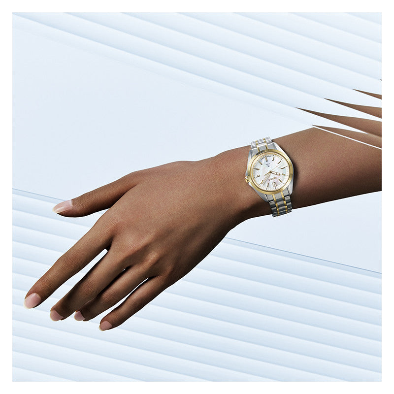 Oplev de første Prospex-modeller til kvinder. Med deres robuste design og vandtæthed på op til 200 meter er Seiko Prospex SEA-urene til kvinder de ideelle ledsagere til maritime eventyr eller elegante hverdagsudflugter. Deres størrelse på 34 mm giver urene en delikat æstetik, der vil pryde ethvert håndled. Urskiverne af kostbar perlemor fås i tre forskellige farver.