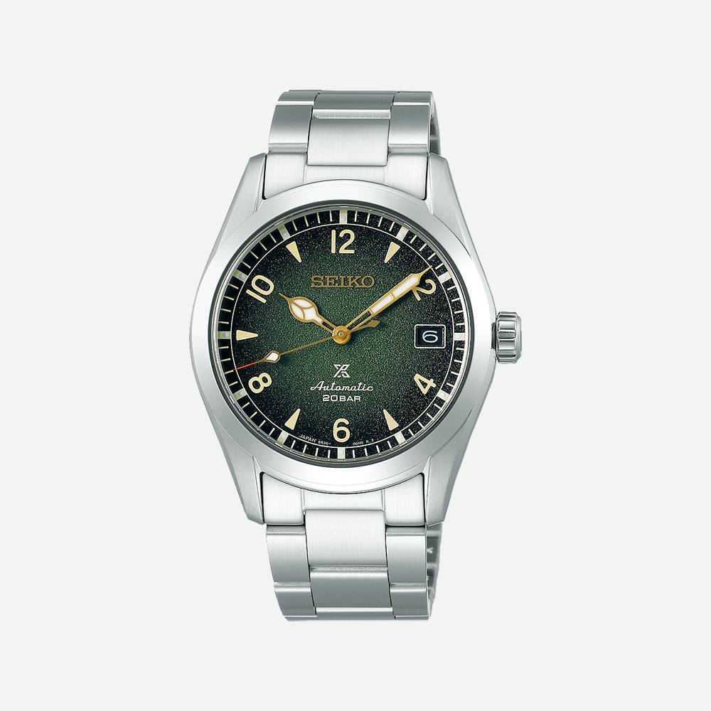 Det ikoniske Seiko "Alpinist" sluttede sig til Prospex-kollektionen i 2020 med X-logoet på urskiven, men beholder stadig sit uovertrufne smarte vintage design. Det automatiske Prospex SPB155J1 ur har den ikoniske farvekombination af grønt på urskiven og guld på visere, indekser og tal. Dette Prospex ur har en vandtæthed på 20 bar og er monteret på en lænke i rustfrit stål, som perfekt fremhæver urskivens farver.