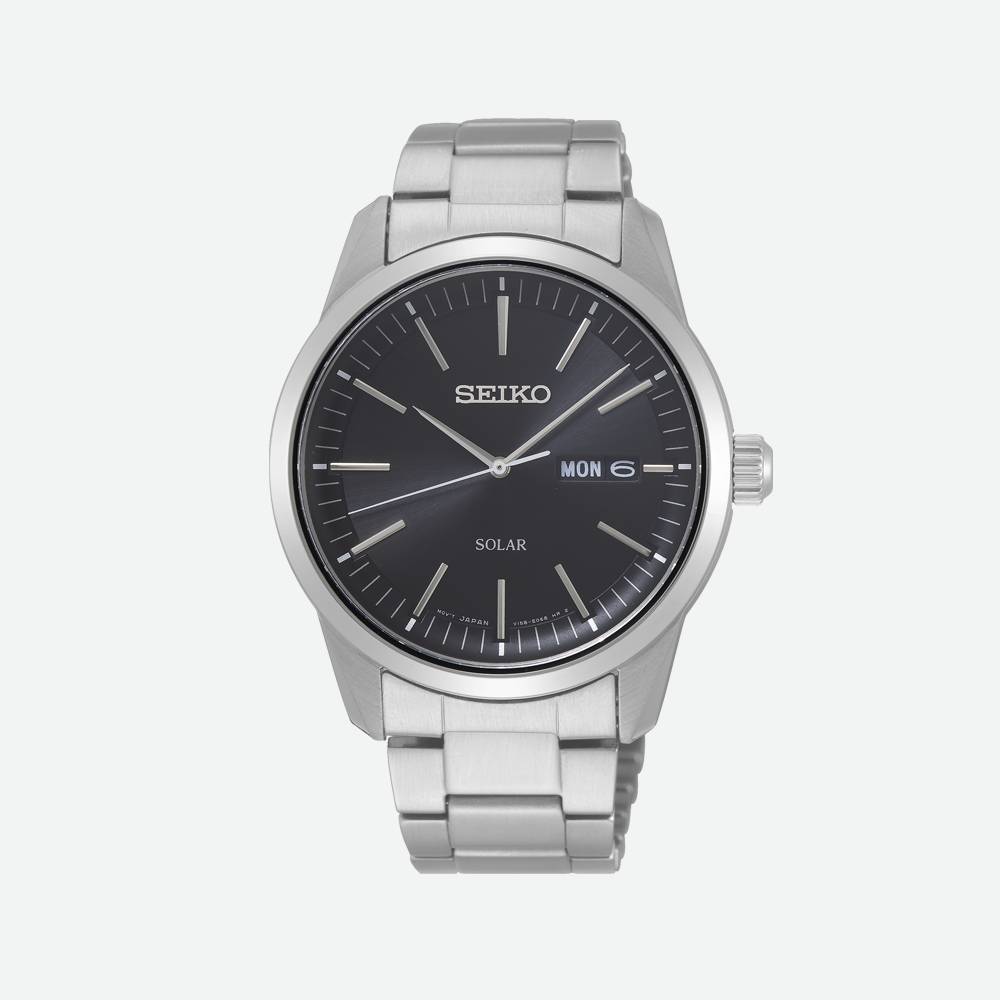 De tre visere samt dag- og datofunktionerne på dette ur er drevet af et sofistikeret solar quartzurværk. Den attraktive sorte skive er faktisk sensoren, der tiltrækker den nødvendige energi til uret. Dette ur i 100 % rustfrit stål og forstærket med et ridsefast safirglas er ikke blot let, det er mindst lige så behageligt at have på, som det er behageligt at se på.