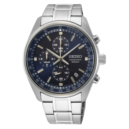 Dette quartzur fra Seiko SPORT-kollektionen har mange funktioner. Faktisk har dets dybblå urskive de tre tællere, der er specifikke for kronografer, og er omgivet af en krans med tachymeter. Denne model i 100 % rustfrit stål er også super solid med sit hardlex-glas, sin påskruede bagside og sin vandtæthed ned til 100 meter.