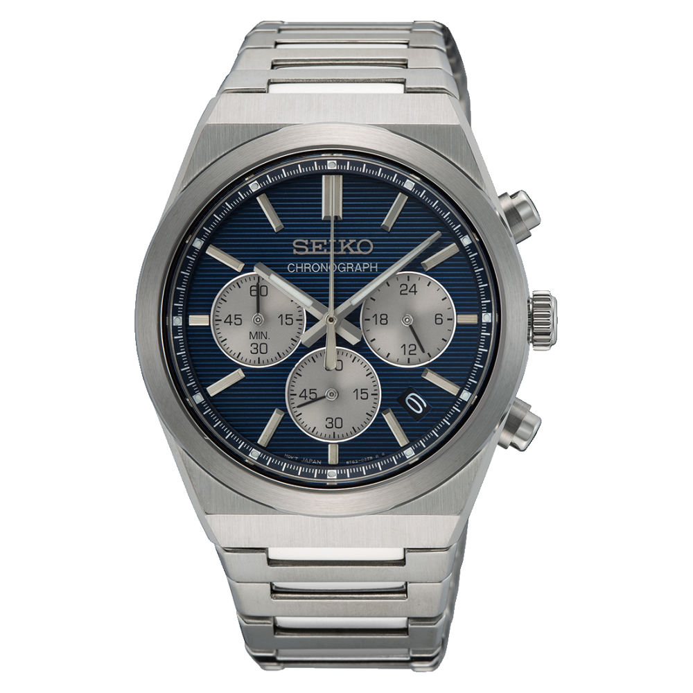 Denne SSB453P1 kvartskronograf fra Seiko SPORT-kollektionen tilbyder en lang række funktioner. På urskiven er der tre tællere, som er typiske for kronografer. Denne model er udelukkende fremstillet i rustfrit stål og er også meget robust med safirglas, skruebund og vandtæthed på 100 meter.