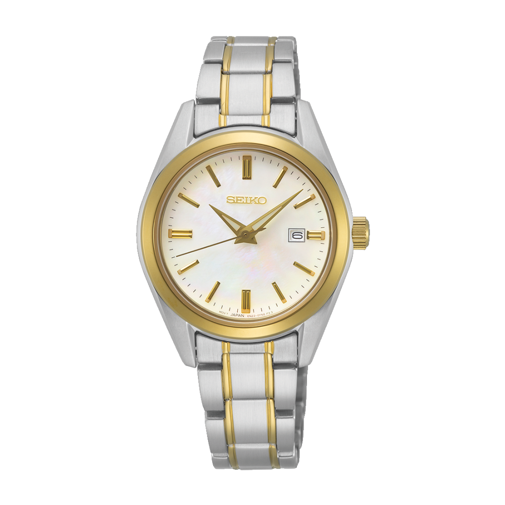 Dette ur egner sig perfekt til at fuldende dine flotte outfits, og det udmærker sig ved renheden af formen på dets urkasse og dets urskive i perlemor. Dette ur i rustfrit stål har en gylden belægning på kransen, kronen og visse led i lænken, hvilket giver et smart look uden at overdrive. Uret er elegant, men solidt, og har en vandtæthed på 10 bar samt ridsefast safirglas.