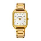 Seiko dameur i klassisk stil med rektangulær urkasse i gulddublé. Lænke og hvid urskive. Uret har mineralglas, quartzværk og er vandtæt til 3 bar.