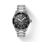 Discover the updated version of one of Tissot's main collections with the new Seastar 40mm Powermatic 80. This new edition has undergone a subtle transformation, incorporating a notch along the edges of the case, resulting in a more compact and sophisticated appearance. This automatic timepiece is the perfect watch for those in search of a sporty yet assertive accessory, offering water resistance up to 1000 feet (300 meters) and improved visibility in dim conditions thanks to the Super-LumiNova® coated hands and hour markers. Discover the unique aesthetic of this stainless steel version with its black gradient dial and matching bezel, following the collection's signature sporty yet bold appeal