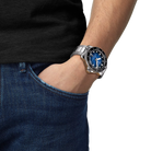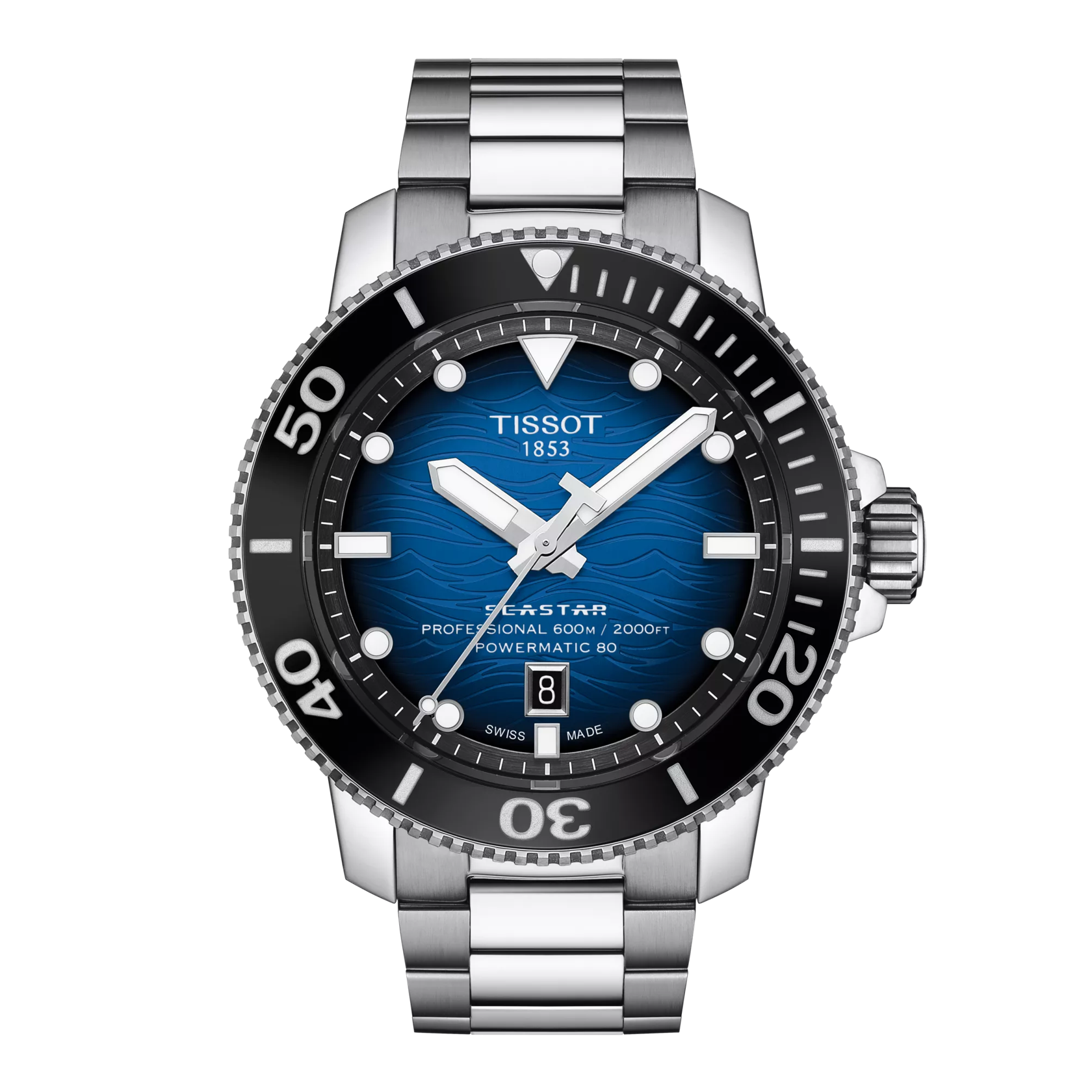 The Tissot family of dive watches welcomes a new, advanced, technical version, the Seastar 2000 Professional. Its profile ticks every box for a high performance watch: water resistant to 600 metres, helium valve, ISO 6425 certification, automatic calibre with longlasting power reserve, ceramic bezel. With its wave patterned, shaded blue dial and its uncompromising design, it is also a timepiece aimed at enthusiasts of extreme nautical style.