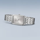 Det slanke, rektangulære urkasse i poleret rustfrit stål måler 23 x 31 mm og er kun 6 mm høj – perfekt til et diskret og behageligt fit. Den sølvfarvede urskive med solstråleeffekt fanger lyset og skaber subtile reflekser, mens romertal ved kl. 12 og kl. 6 samt fine indeks giver et klart, stilfuldt udtryk.
