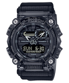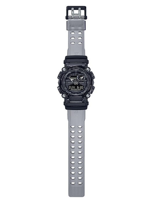 A heavy-duty model that can be used in tough environments as well as for street fashion. The nut-like 10-sided bezel is fastened with screws to express the industrial design motif, and is finished in a rugged, tough and straightforward design. The use of analogue hands with a digital display also enhances usability. High visibility is achieved, even in the powerful face, by inserting graphics on the hands and dial. Additionally, the lug ends of the band and all the function buttons, including the front button, are engraved with non-slip checkering for excellent operability. Features skeleton-type colouring based around grey. Based on the rugged, tough form of the GA-900, this skeleton series model features chic colouring making it suitable as a fashion item.